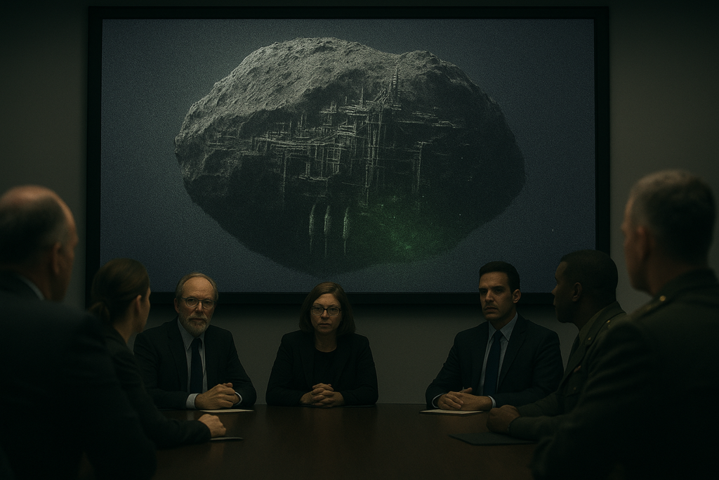 Yet not before one of them, a fading, aging orbiter, transmitted a final image. Grainy, over-compressed, corrupted in half its frame—but unmistakable. Floating against the black was the silhouette of a massive structure. Metallic ribbing, lattices, geometry that no rock ever wore. It looked like a city grafted onto an asteroid, or a ship dressed in stone.